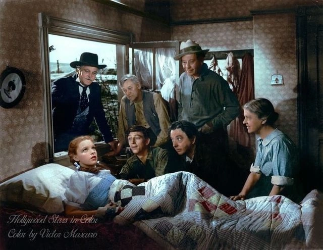 ……as Dorothy wakes up……she is confused, yet alert, she is in her old room, back in Kansas, and she has all her friends around her….alll the familiar faces from her dream when the hurricane swept her away, the people who were here friends who she met whilst in ‘Oz’, are now all gathered around her bed, waiting for her to wake up