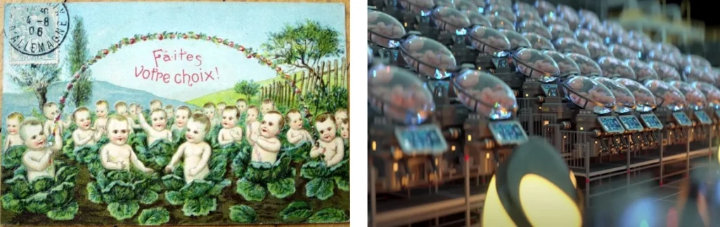 Babies seen in ‘Farming’ situations, in trees, Gooseberry Bushes, & apparently growing in cabbage fields…….. it’s all ‘In plain sight’ that the new populations are all grown in Labs, in the D.U.M.B. Bases…..